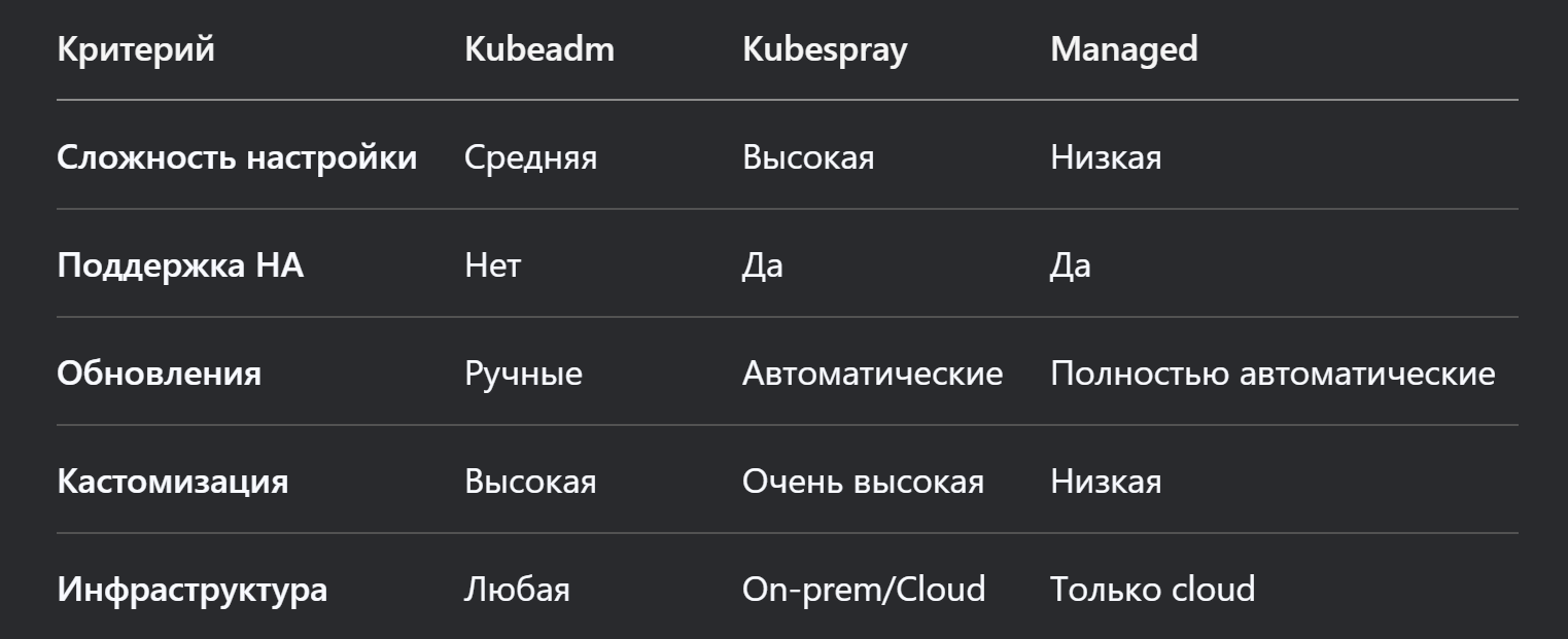 Развертывание Kubernetes-кластера может осуществляться различными способами, каждый из которых имеет свои преимущества и оптимальные сценарии использования. В этой статье мы детально разберем три основных подхода: официальный инструмент Kubeadm, Ansible-решение Kubespray и managed-решения от облачных провайдеров.