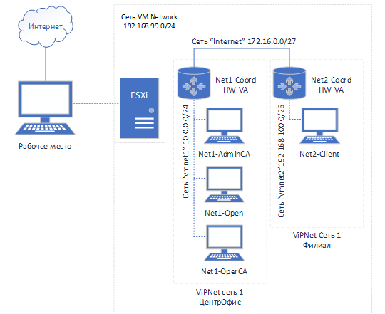 С помощью технологии виртуальных машин VMWareWorkstation для выполнения задания смоделирована корпоративная сеть организации на 2 филиалах и 1 офисе партнеров.