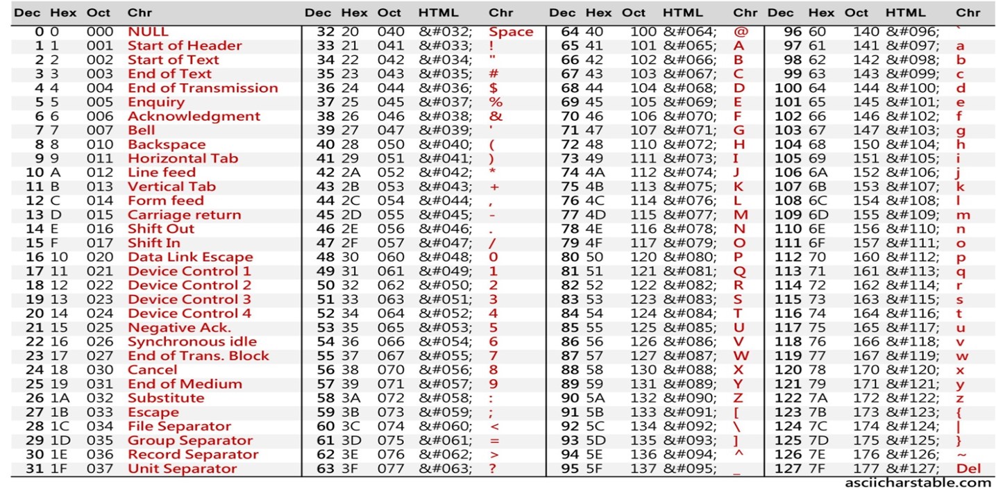 Таблица кодов содержит 16 столбцов и 16 строк; каждая строка и столбец пронумерованы в шестнадцатеричной системе счисления цифрами от 0 до F. Шестнадцатеричное представление ASCII-кода складывается из номера столбца и номера строки, в которых располагается символ. Так, например, ASCII-код символа 1 есть число 31, что по правилам перевода означает 110001. В двоичной системе код представляется восемью разрядами, т.е. двоичный ASCII-код символа 1 есть 00110001.