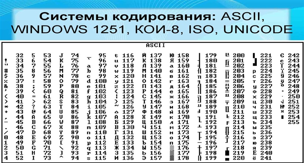 Данная таблица делится на две части: столбцы с номерами от 0 до 7 составляют стандарт кода – неизменяемую часть; столбцы с номерами от 8 до F являются расширением кода и используются, в частности, для кодирования символов национальных алфавитов. В столбцах с номерами 0 и 1 находятся управляющие символы, которые используются, в частности, для управления принтером. Столбцы с номерами от 2 до 7 содержат знаки препинания, арифметических действий, некоторые служебные символы, а также заглавные и строчные буквы латинского алфавита. Расширение кода включает символы псевдографики, буквы национальных алфавитов и другие символы.