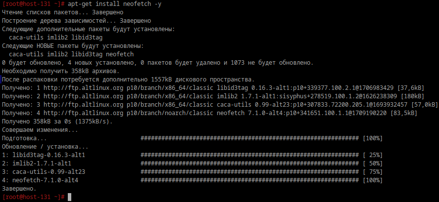 Введите apt-get install neofetch -y