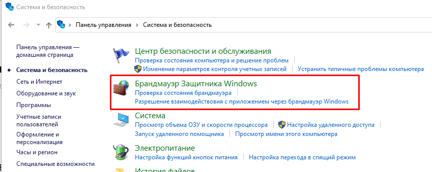 Чтобы запустить Брандмауэр Windows через панель управления необходимо: открыть панель управления, перейти в раздел Система и безопасность и выбрать раздел Брандмауэр Защитника Windows.
