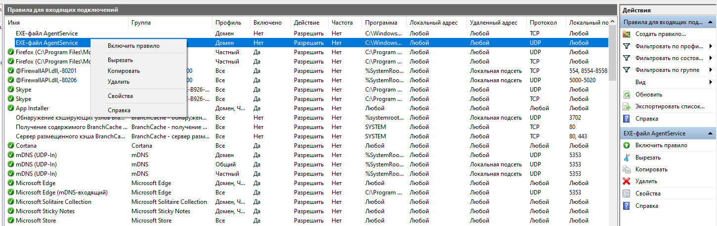 Для включения, отключения или удаления правила можно сделать необходимое нажав на него правой клавишей мыши или выбрать действие в меню справа.