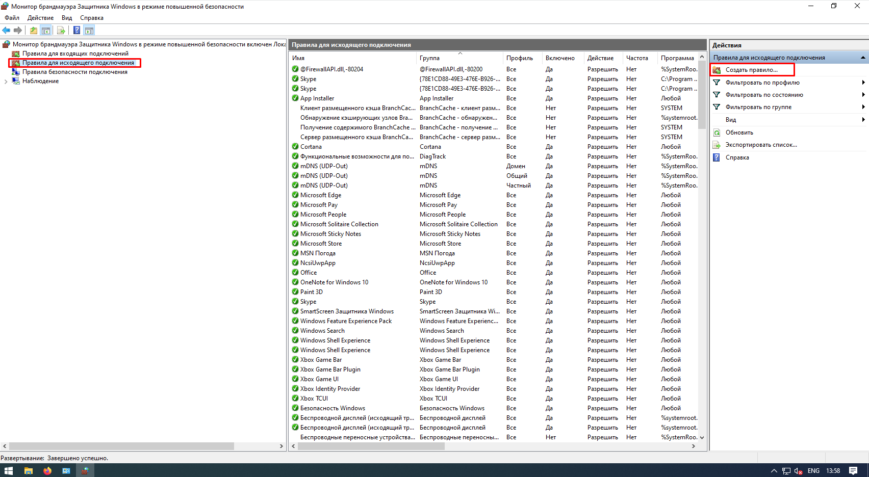 Чтобы создать правило: перейдите в «Правила для исходящего подключения» и нажмите «Создать правило» в столбце справа.
