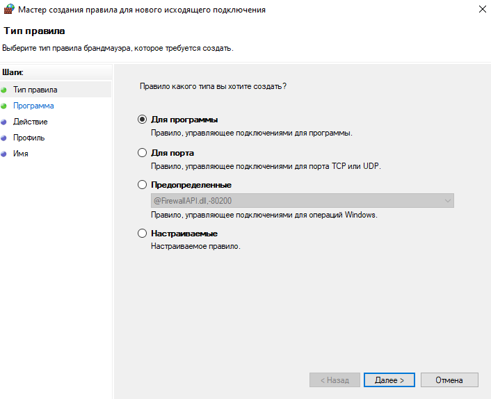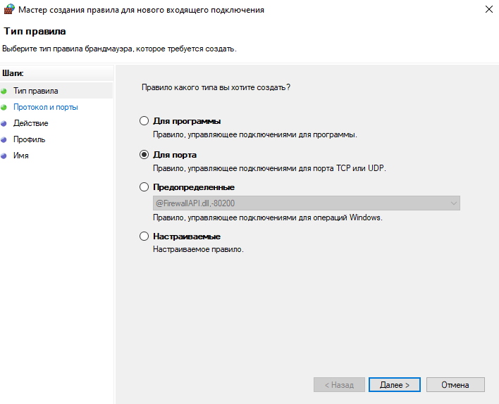 В типе правил выбираем правило для порта: