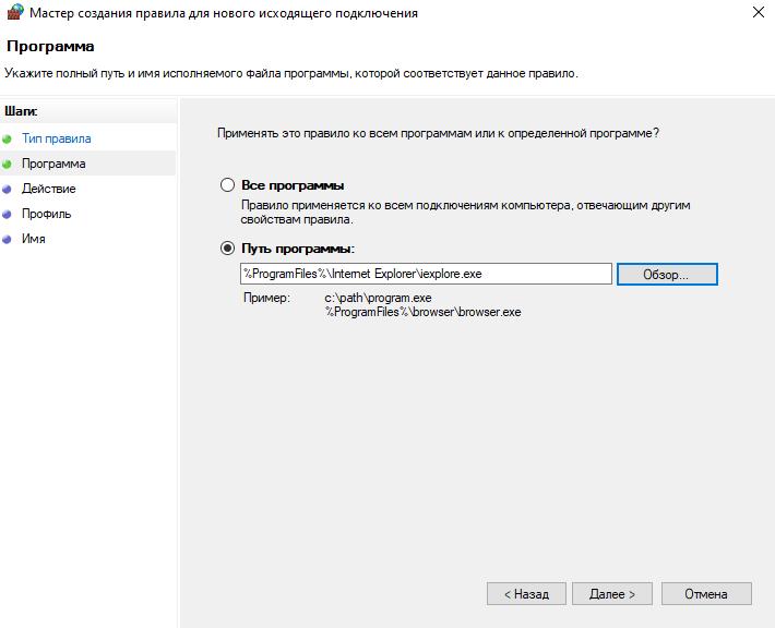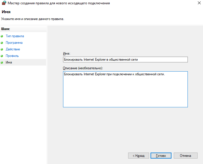 Пример: создадим исходящее правило, которое блокирует доступ к сети и Интернет для приложения Internet Explorer, только когда вы подключены к ненадежным общедоступным сетям.