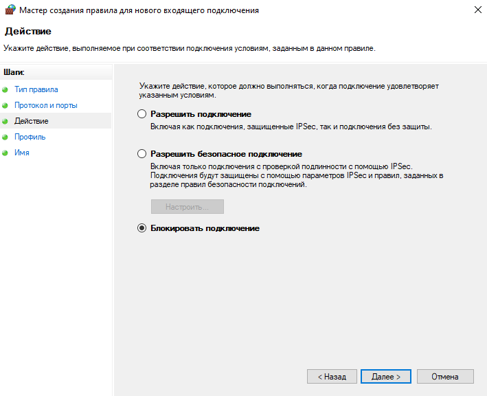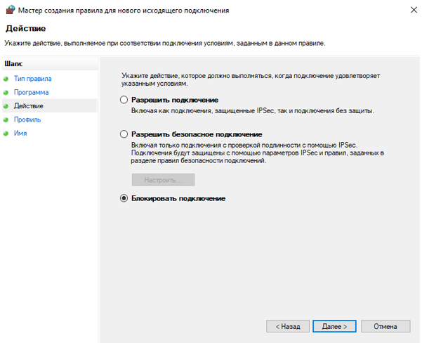 Отметим «Блокировать подключение»: