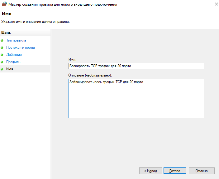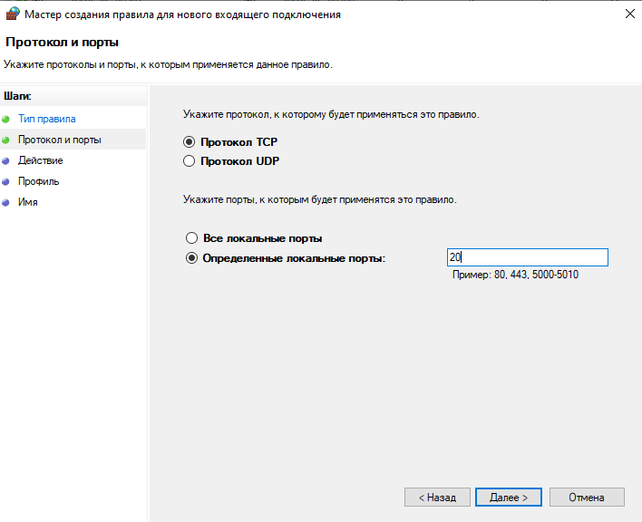 Например: заблокируем 20 TCP и 21 UDP порты для входящих подключений (20, 21 порты используются FTP)