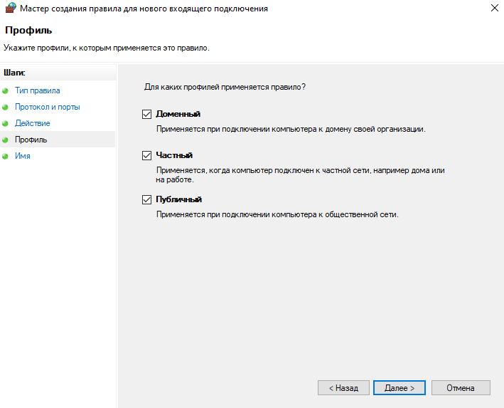 Поскольку мы блокируем весь TCP–трафик на порте 20, выбираем все три профиля и продолжаем:
