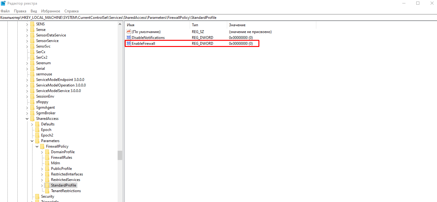 Компьютер\HKEY_LOCAL_MACHINE\SYSTEM\CurrentControlSet\Services\SharedAccess\Parameters\FirewallPolicy\StandardProfile. Вписываем в данный параметр 0.