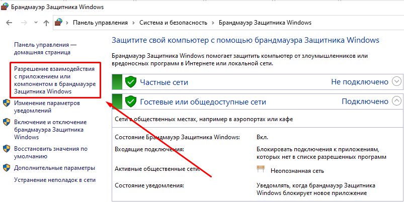 Откройте брандмауэр Windows, в столбце слева кликните по ссылке «Разрешение взаимодействия с приложениями или компонентом в брандмауэре Защитника Windows».