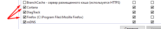 Вы заметите, что к некоторым записям в левой части от их названия установлены галочки. Это означает, что правило для этого приложения, программы или функции включено и используется для разрешения или блокировки доступа.