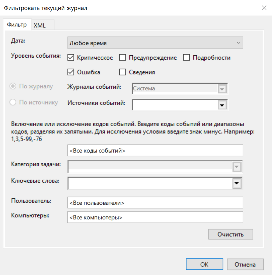 Вот пример фильтрации, я вывел в журнал только события с уровнями - Критическая и Ошибка: