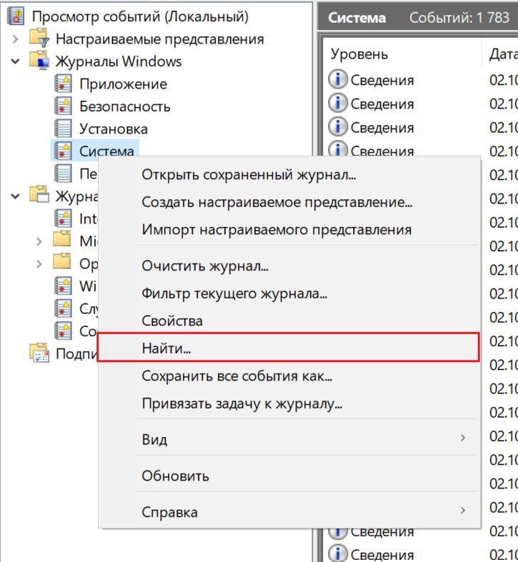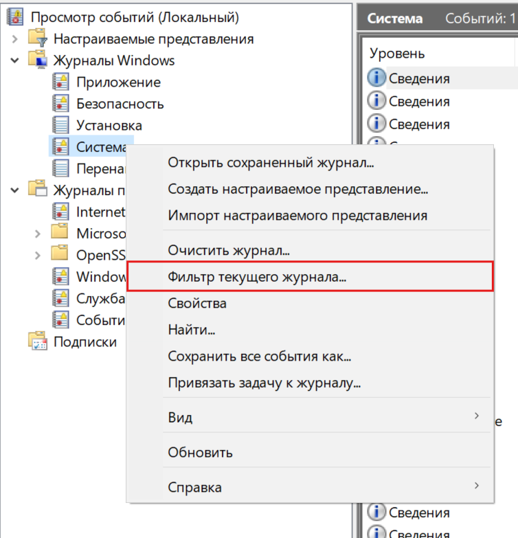 Чтобы использовать фильтры для поиска определенного типа журнала, выполните следующие действия. Откройте просмотр событий, разверните группу событий, щелкните категорию правой кнопкой мыши и выберите параметр «Фильтр текущего журнала».