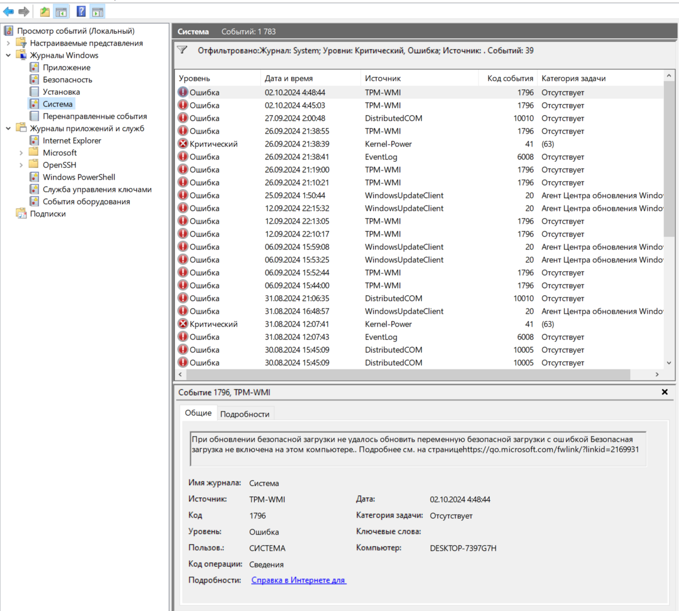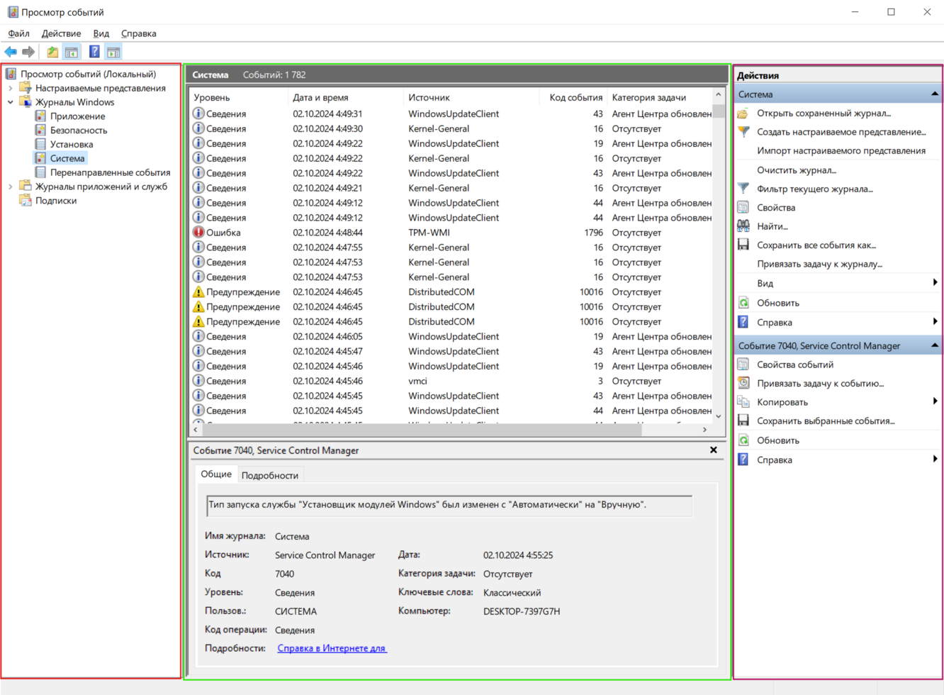 Когда мы выбираем событие в одной из категорий Журналов Windows, то видим: