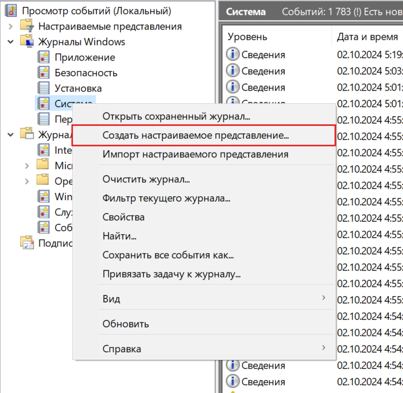 В таком случае можно создать настраиваемое приложение. Для этого нужно: открыть просмотр событий, развернуть группу событий, щелкнуть категорию правой кнопкой мыши и выбрать параметр «Создать настраиваемое представление», выбрать фильтр и настроить его.