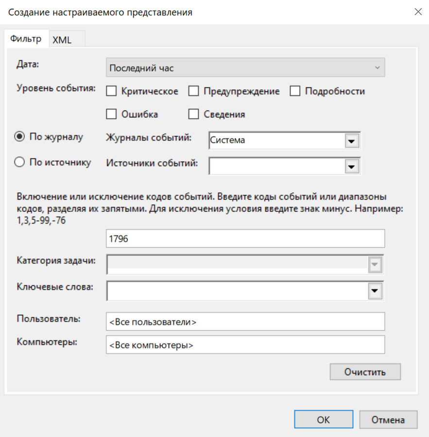 Настройка фильтра для сведений с кодом событий «1796» за последний час.