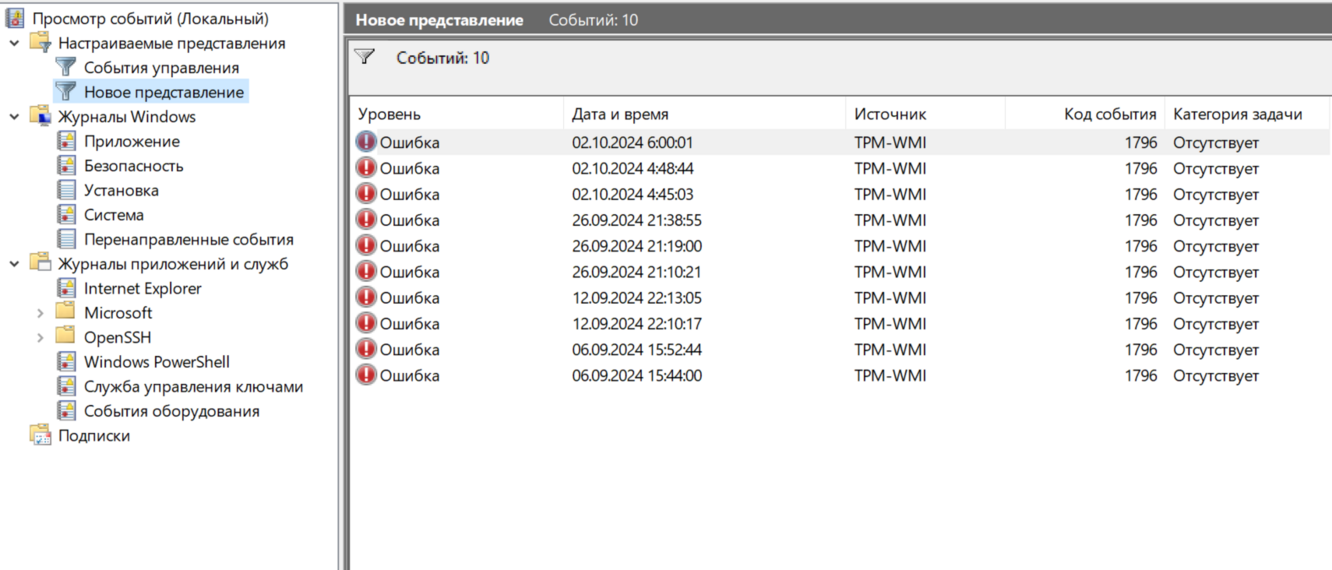 В левой панели находится древовидная структура, в которой отсортированы события по различным параметрам. Кроме этого, сюда же можно добавить собственные «Настраиваемые представления», в которых будут отображаться лишь нужные вам события.
