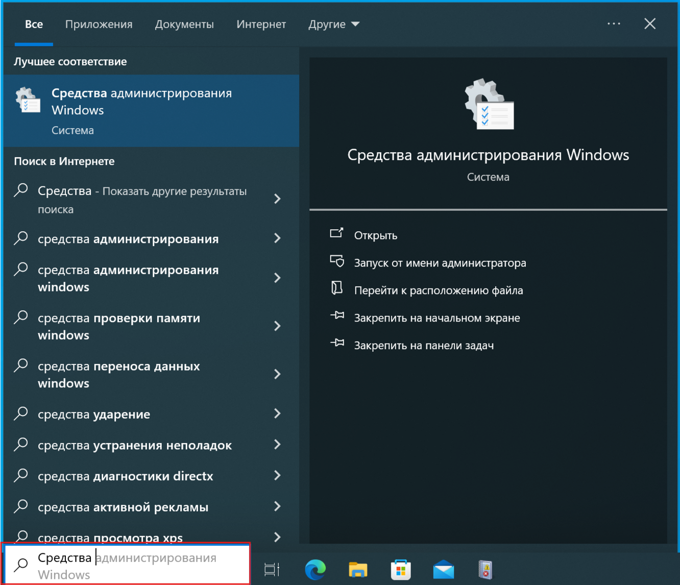 Еще один способ, который также подойдет для всех актуальных версий ОС – найти Средства администрирования Windows (В Windows 11 название было изменено на "Инструменты Windows") и выбрать там соответствующий пункт: