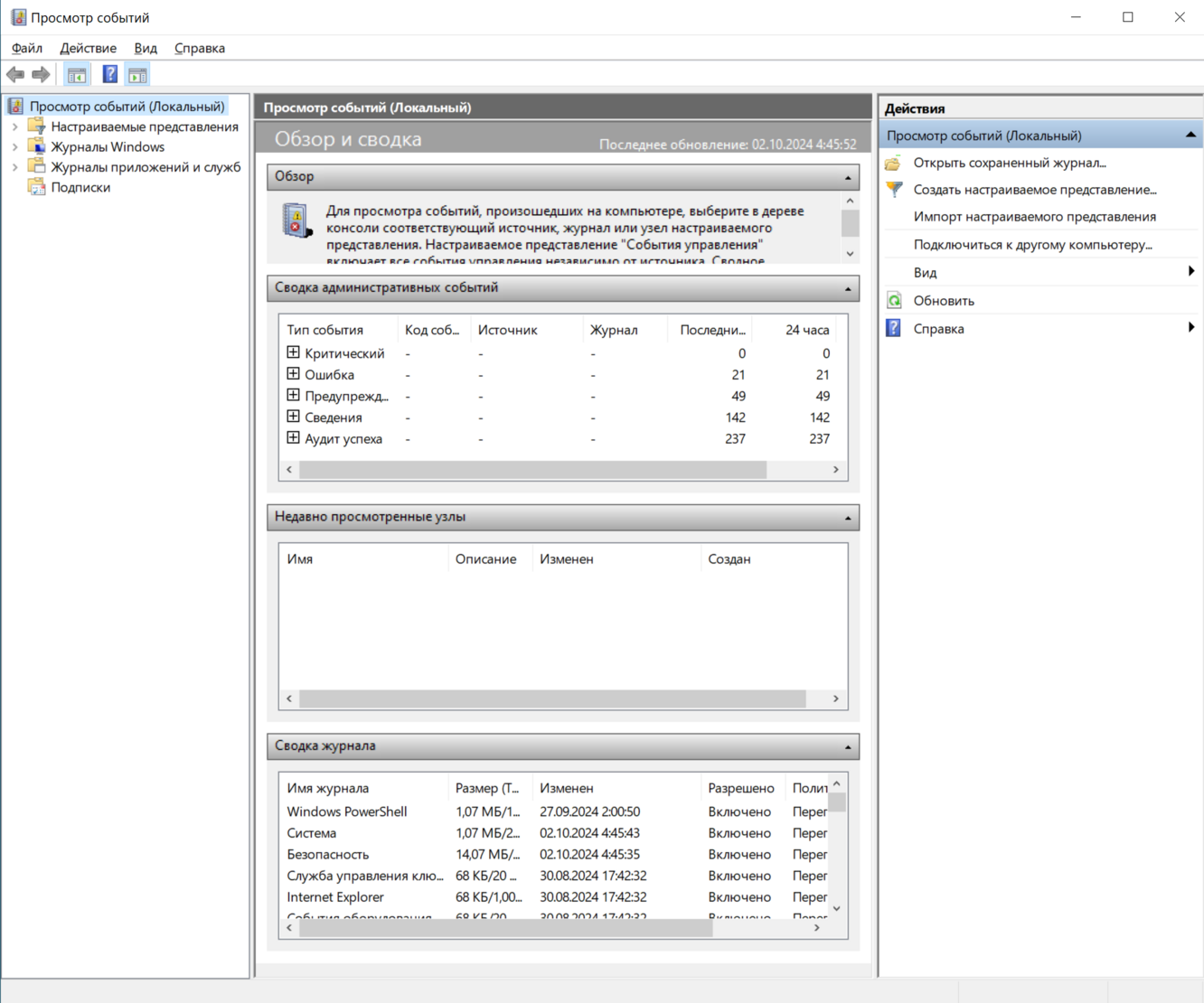 В правой части собраны ссылки на действия, позволяющие отфильтровать события по параметрам, найти нужные, создать настраиваемые представления, сохранить список и создать задачу в планировщике заданий, которая будет связана с определенным событием.