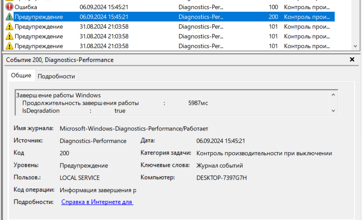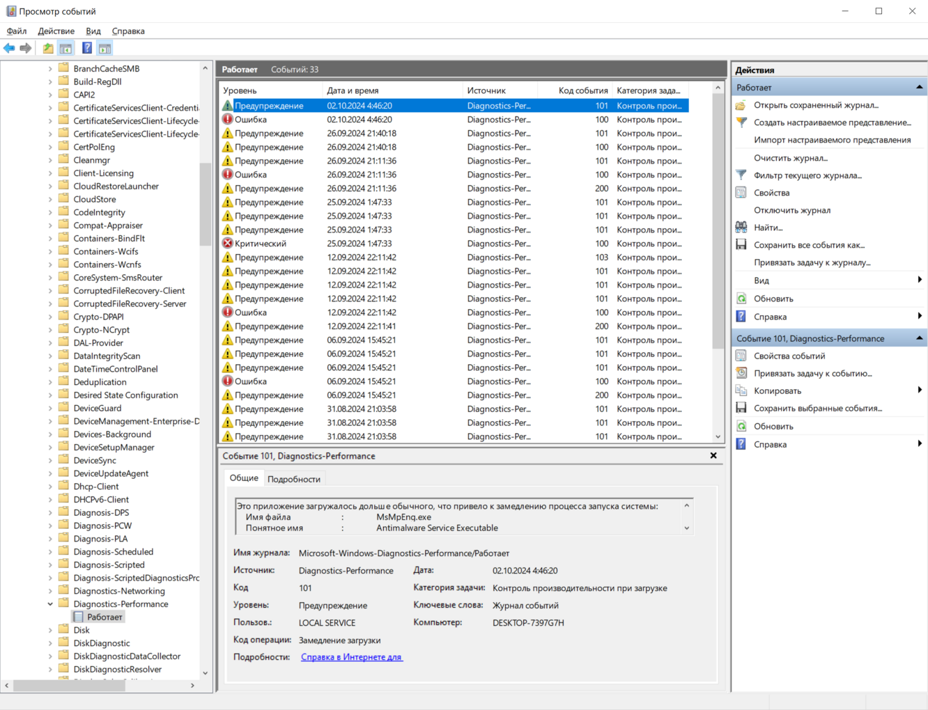 Для этого в правой панели откройте Журналы приложений и служб – Microsoft — Windows – Diagnostics–Perfomance – Работает и посмотрите, есть ли среди событий какие–либо ошибки – они сообщают о том, что какой–то компонент или программа привела к замедлению загрузки Windows.