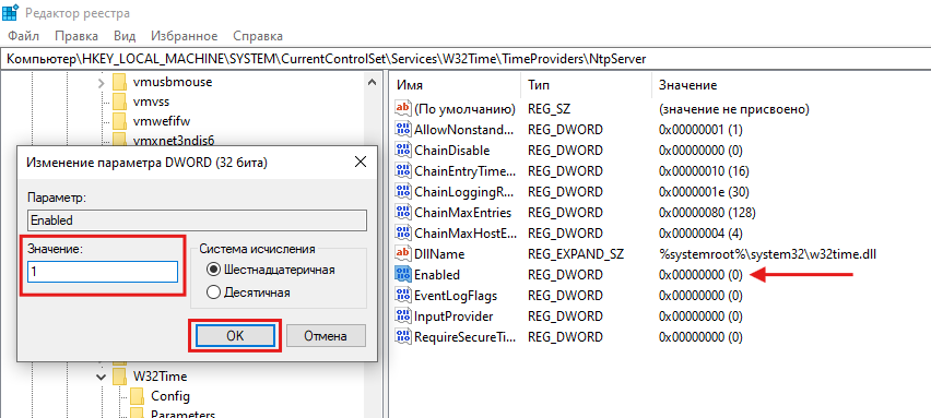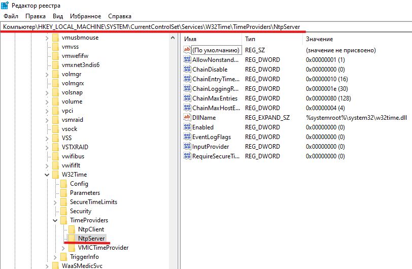 В Редакторе реестра перейдите по пути \HKEY_LOCAL_MACHINE\SYSTEM\CurrentControlSet\Services\W32Time\TimeProviders\NtpServer.
