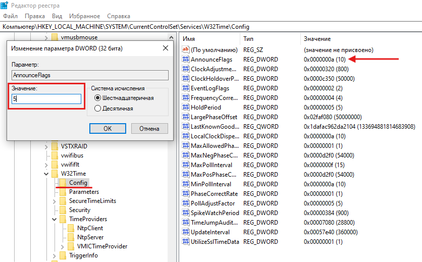 В Редакторе реестра перейдите по пути \HKEY_LOCAL_MACHINE\SYSTEM\CurrentControlSet\Services\W32Time\Config.