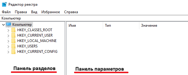 Интерфейс Редактора реестра представляет собой обычное окно со строкой заголовка, строкой меню (Файл, Правка, Вид, Избранное, Справка). Рабочее окно Редактора реестра разделено на две части: в левой (Панель разделов) отображаются ветви, разделы и подразделы, в правой (Панель параметров) – параметры выбранного элемента Реестра. По своей сути программа RegEdit мало отличается от файлового менеджера Проводник Windows.