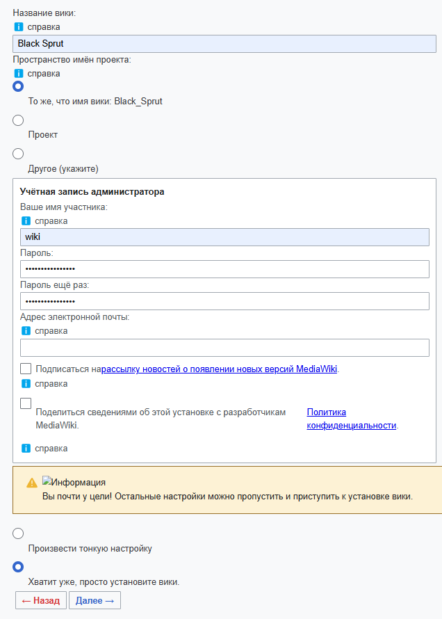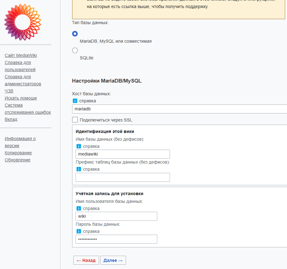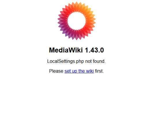 Чтобы наша wiki полноценно заработала, мы должны зайти на веб-интерфейс, произвести первоначальную настройку, получить файл с этими настройками (LocalSettings.php) и примонтировать его к контейнеру.