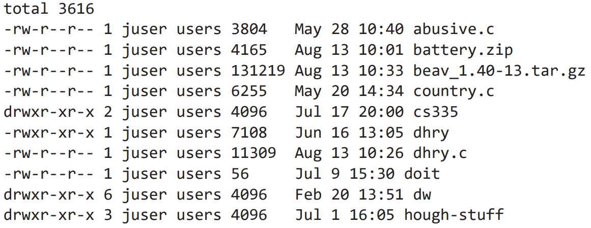Команда ls перечисляет (lists) содержимое каталога. По умолчанию используется текущий каталог, но вы можете добавить любой каталог или файл в качестве аргумента, и для этой операции существует много полезных параметров. Например, применяйте ls -l для подробного (long, длинного) списка и ls -F для отображения информации о типе файла. Вот пример длинного списка, он включает владельца файла (столбец 3), группу (столбец 4), размер файла (столбец 5) и дату/время изменения (между столбцом 5 и именем файла):