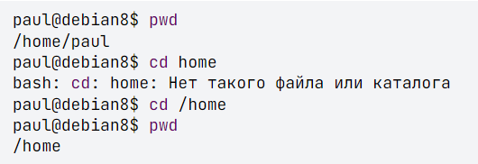 В примере ниже показано, что текущей директорией является директория /home/paul. Для перехода из этой директории в директорию /home вам придется ввести команду cd /home вместо команды cd home.