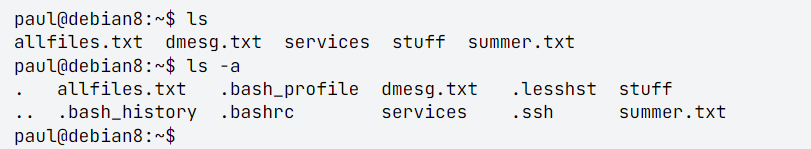 Часто используемым параметром утилиты ls является параметр -a, который предназначен для вывода информации обо всех файлах. Под выводом информации обо всех файлах подразумевается вывод информации в том числе и о скрытых файлах. В том случае, если имя файла в рамках файловой системы Linux начинается с символа точки, он считается скрытым файлом и не включается в обычные списки содержимого директорий.