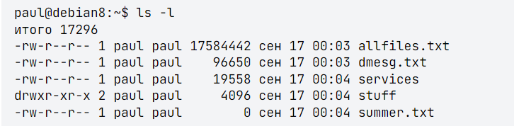 Вам придется многократно использовать параметры утилиты ls для вывода информации о содержимом директории в различных форматах или для вывода информации о различных файлах из директории. Команда ls без параметров позволяет получить список файлов, расположенных в директории. Команда ls -l (в качестве параметра использована строчная буква L, а не число 1) позволяет получить более подробный список файлов.