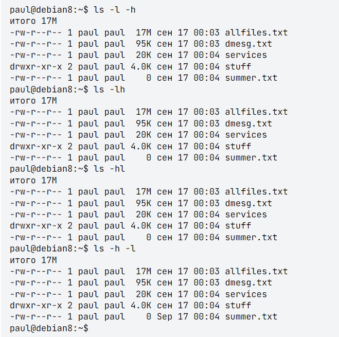 Другим периодически используемым параметром утилиты ls является параметр -h. Он позволяет выводить числовые значения (соответствующие размерам файлов) в формате, лучше читаемом человеком. Также в примере ниже показаны варианты передачи параметров утилите ls. Позднее в данной книге будут даны подробные пояснения относительно выводимых данных.