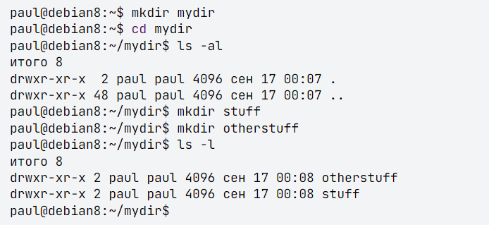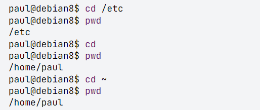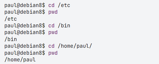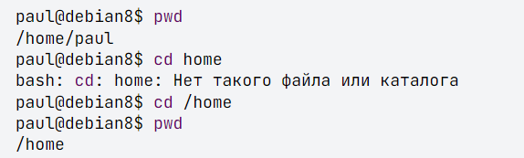 В примере ниже показано, что текущей директорией является директория /home/paul. Для перехода из этой директории в директорию /home вам придется ввести команду cd /home вместо команды cd home.