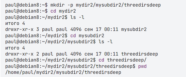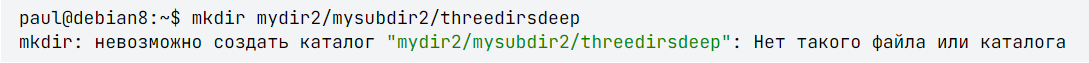 Исполнение следующей команды закончится неудачей, так как родительской директории для директории threedirsdeep не существует.