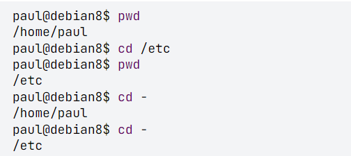 Другой полезный вариант использования команды cd заключается в выполнении простой команды cd - для перехода в предыдущую директорию.