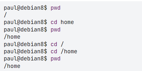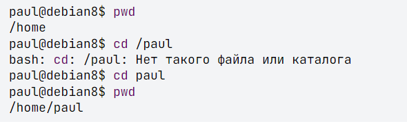 При нахождении в директории /home вам придется ввести команду cd paul вместо команды cd /paul для перехода в поддиректорию paul текущей директории /home.