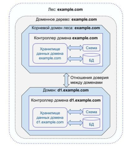 Для каждого домена настраивается минимум один сервер с ролью контроллер домена, на котором работают сервисы AD. Он хранит информацию об объектах своего домена, и реализует операции поиска в каталоге, входа пользователей и проверки подлинности.