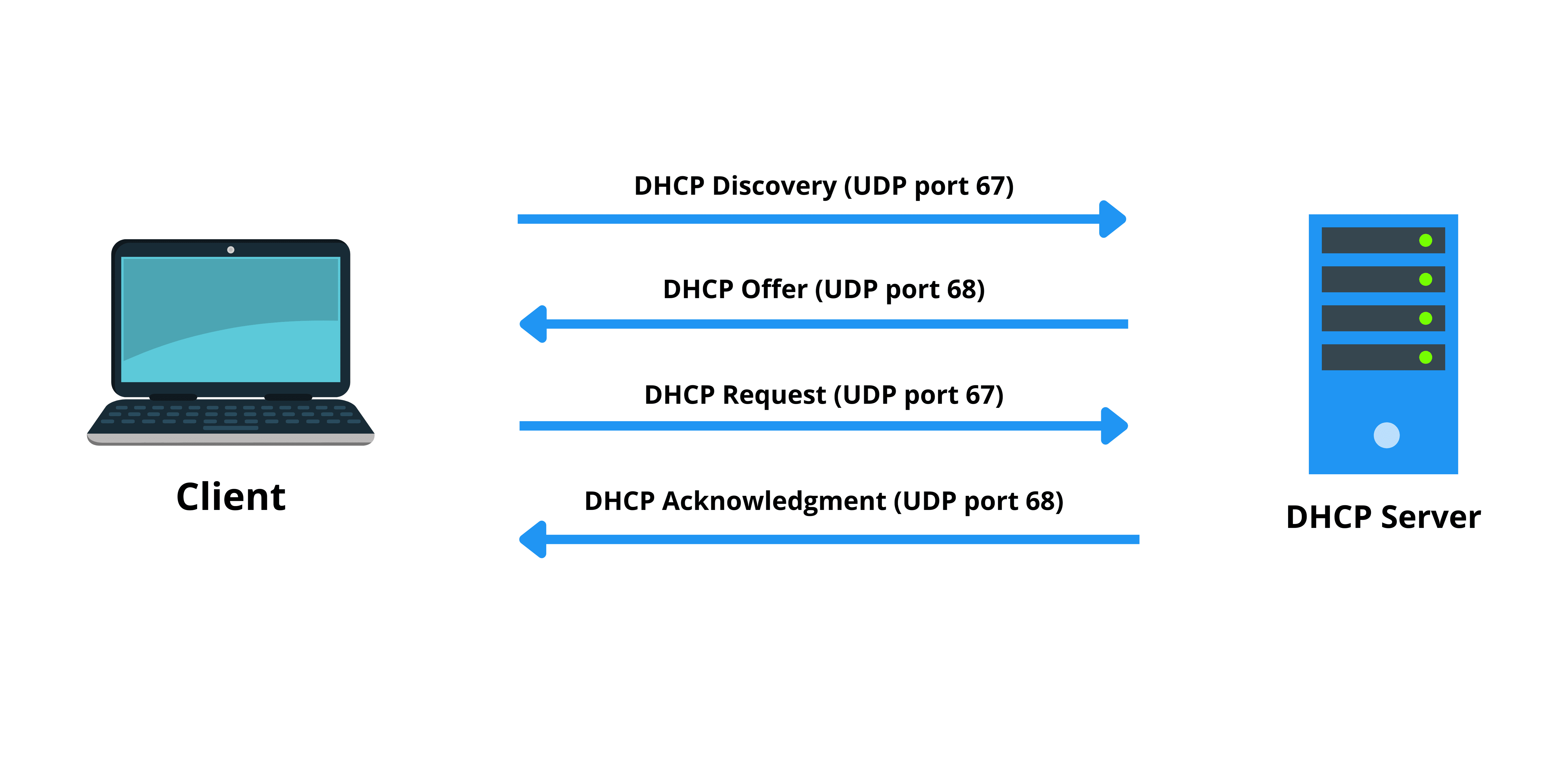 Получение адреса проходит в четыре шага. Этот процесс называют DORA по первым буквам каждого шага: Discovery, Offer, Request, Acknowledgement.